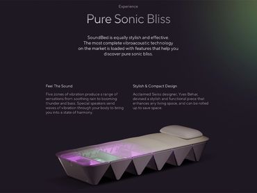 SoundBed is immersive Multi-Sensory Sound Healing Meditation Therapy. Pure Resonance, Physical Vibration & Harmonic Frequency felt throughout the whole body. Each section of the SoundBed has a motor inside. This motor produces physical vibration in rhythm with unique and specific frequency (HZ). Just lie down, relax and enjoy a 22 minute session of pure multi-sensory meditation bliss. Immerse into the healing power of mindfulness to Release, Renew and Balance the Body & Mind. SoundBed takes you deep into a physical & emotional meditation healing & into a full multi-sensory Nervous System Restoration. Complete SoundBed Treatment Consists Of Three Separate Advancing Levels. Start with LEVEL I.